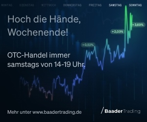 Mit Baader Trading können Sie handeln, solange die News aus aller Welt aktuell sind. Montag bis Freitag von 7:30 bis 23:00 Uhr und am Samstag von 14:00 bis 19:00 Uhr. Echtzeitkurse, Neues aus dem Finanzmarkt, persönliche Watchlist, börsentägliche Videonews und alles rund ums Trading auf einen Blick. Jetzt handeln: Baader Trading!