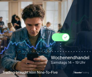 Mit Baader Trading können Sie handeln, solange die News aus aller Welt aktuell sind. Montag bis Freitag von 7:30 bis 23:00 Uhr und am Samstag von 14:00 bis 19:00 Uhr. Echtzeitkurse, Neues aus dem Finanzmarkt, persönliche Watchlist, börsentägliche Videonews und alles rund ums Trading auf einen Blick. Jetzt handeln: www.baadertrading.de!